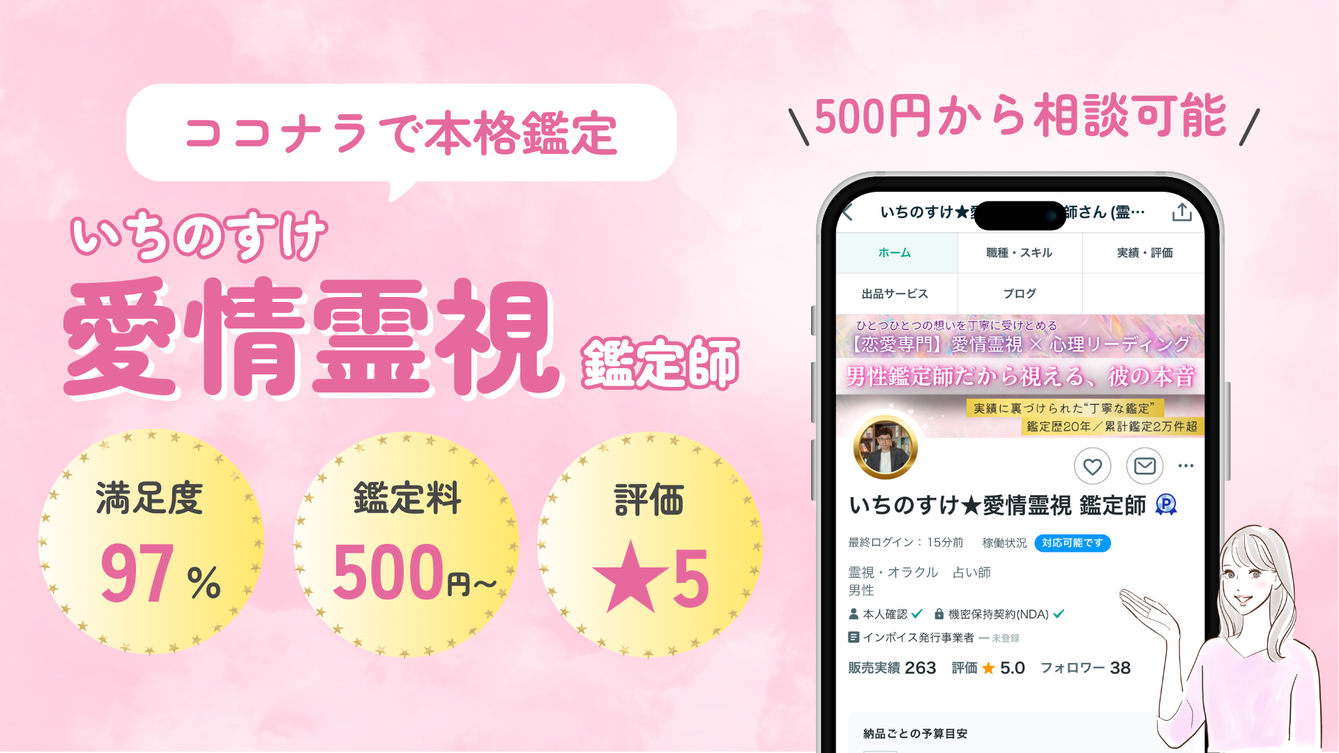 いちのすけのココナラ占いは、あなたを否定しません。複雑な恋の悩みを紐解き、あなたが自然体でいられるように、進むべき道を一緒に考えます。 寄り添うような安心感が選ばれる理由です。